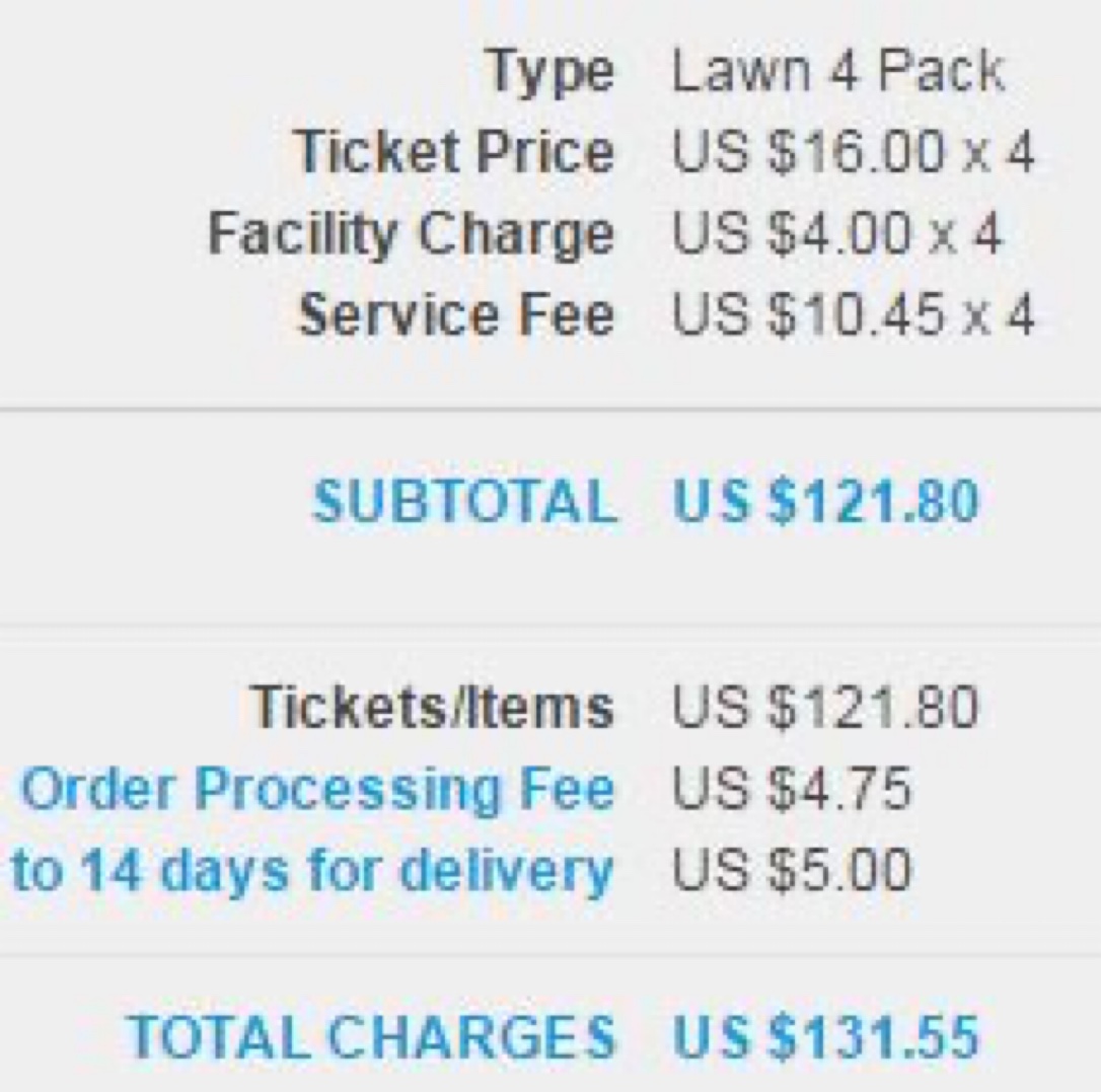 Here are 4 x $16 tickets ($64), with a total of $67.55 worth of fees on top (~105%).