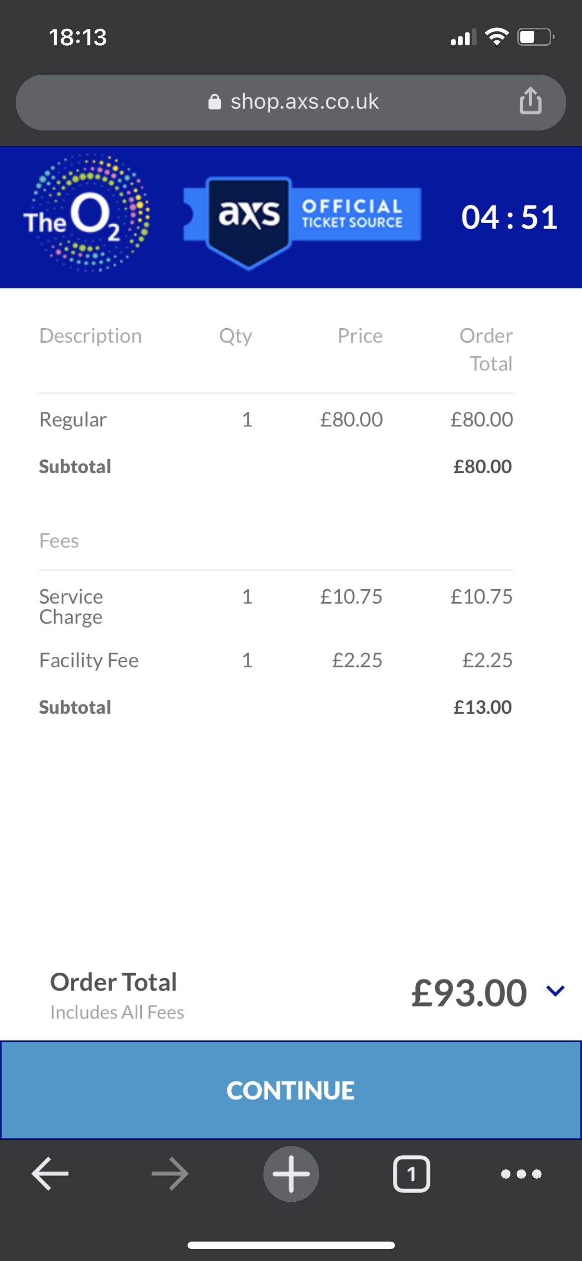 So that’s a total of £15.70 of fees on top of an £80 ticket. Just shy of 20% of the ticket face value again in fees. Not great – but we’re in the UK and have the benefit of being able to shop around! Let’s see what’s on offer at AXS for the same show…